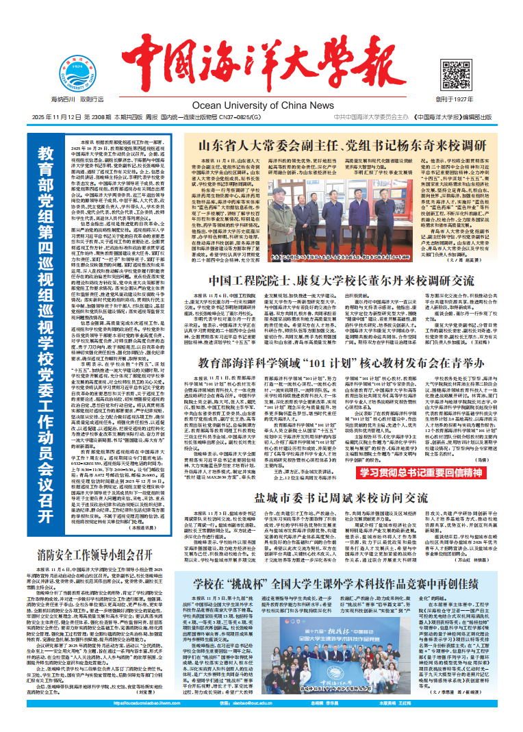 11月6日,中国工程院院士、康复大学校长董尔丹一行来校调研交流。学校党委书记李明陪同调研并座谈,校长张峻峰会见了董尔丹校长。李明代表学校对董尔丹一行表示欢迎。他表示,中国海洋大学正在认真学习贯彻党的二十届四中全会精神,全面贯彻落实习近平总书记重要回信精神,推进谋划学校“十五五”事业发展规划,加快推进一流大学建设。康复大学作为一所新型研究型大学,与中国海洋大学有着良好的交流合作基础,双方共同扎根齐...