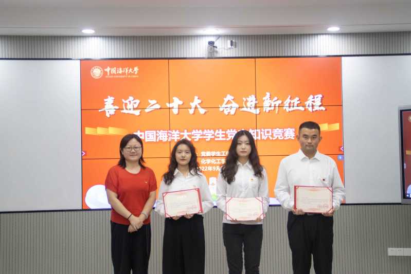 本站讯9月30日,为用好党史这部“教材”,巩固拓展党史学习教育成果,由党委学生工作部主办,化学化工学院党委承办的中国海洋大学“喜迎二十大,奋进新征程”学生党史知识竞赛暨第十二届“我与祖国共奋进”学生党员教育活动颁奖典礼于在崂山校区举行。学生工作处副处长钟媛,马克思主义学院党委副书记王付欣,党委组织部王鹏出席活动并担任评委,化学化工学院党委副书记李新出席活动。根据学生党史知识竞赛初赛网络答题情况,传承队、海晏队、星梦队、逐梦队、奋楫笃行队、红船队共六支参赛队伍进入了现场决赛环节。他们由来自化学化工学院、海洋与大气学院、海洋生命学院、环境科学与工程学院、法学院、管理学院、外国语学院、海洋地球科学学院...