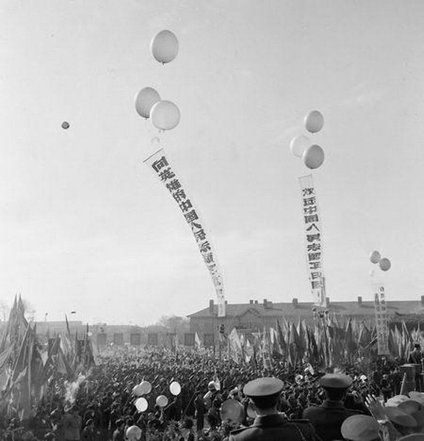 这是1958年10月27日,安东市(今辽宁丹东)各界人民举行集会,庆祝中国人民志愿军胜利回国。