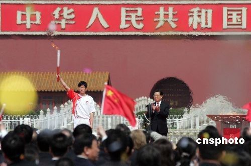 胡锦涛宣布,北京2008年奥运会火炬接力开始。