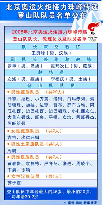 张志坚说,登山队员中年龄最大的46岁,最小的20岁,平均年龄30.2岁。