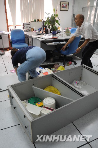 5月12日,成都震感强烈。这是新华社四川分社技术室内被晃倒的办公用品。 据国家地震台网测定,北京时间5月12日14时28分,在四川汶川县发生7.6级地震。 新华社记者陈燮摄