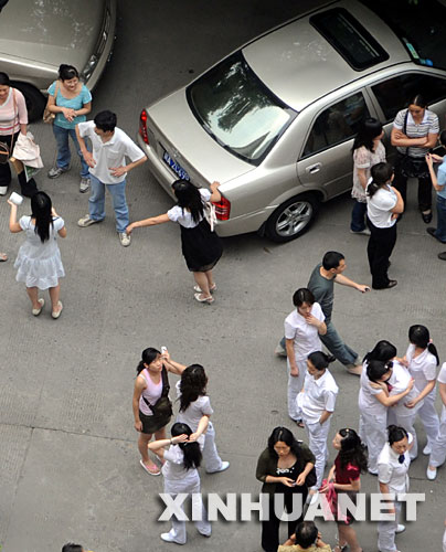 5月12日,成都震感强烈,成都市民在街上躲避。 据国家地震台网测定,北京时间5月12日14时28分,在四川汶川县发生7.6级地震。 新华社记者陈燮摄