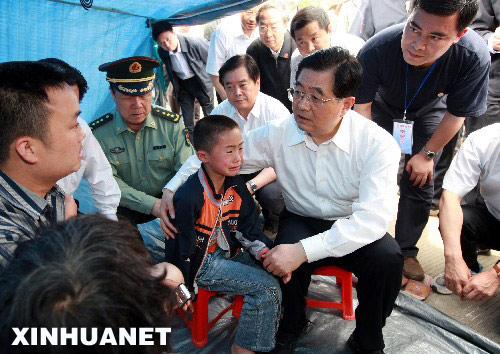 5月18日,中共中央总书记、国家主席、中央军委主席胡锦涛来到灾情严重的四川省什邡市看望慰问受灾群众和救援人员。这是胡锦涛在什邡市区一个灾民安置点看望受灾群众。 新华社记者鞠鹏摄