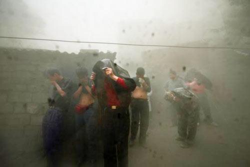 掺杂着浓浓泥土味的空气让人窒息,人们感到呼吸困难,赶紧用衣服捂住口鼻