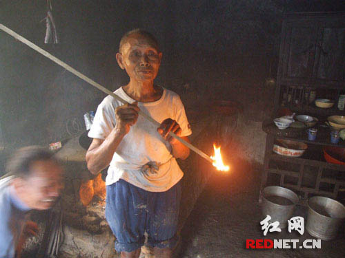 (晚上,不用电,不点灯,用竹片照明;墙上是前年的腊肉,一直吃到现在。)何永康/摄影