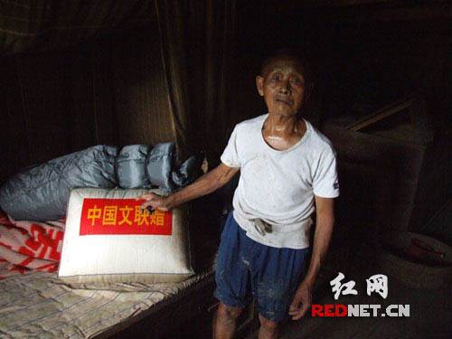 尽管日子清苦,但老人不管遇到什么困难,从不向当地政府伸手,也从不接受别人的施舍救济。他总是这样对别人说:“只要自己身体好,能劳动,就不能向上伸手和接受别人救济。”自从他成了知名人士之后,国内外一些好心人也纷纷给他寄钱寄物,又被他一一转捐了出去。其中广东一个不愿留名的好心人在资兴还专门给他开了一个账号,并每月按期寄来200元生活费,老人至今也分文未取。湖南卫视一名新闻女主播在采访他时,把1000元钱偷偷放在他家中,被他及时发现后而婉言谢绝。两年前的那次山洪冲垮了他的这间住房,也由于他只想着他人,从不考虑自己,至今还没重修。何家山乡党政领导见他拒绝一切救济,又这样苛刻自己,实在看不下去,先后两次上门接他进乡敬老院,又每次被他婉言谢绝。可是,就这么个老人,在我国的那场特大洪灾中和这次特大地震灾害中,却能竭尽全力,慷慨解囊。
