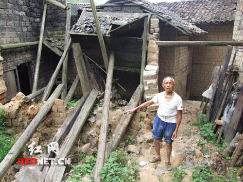 (老人在7.15洪灾倒塌的房屋至今还没修复,总是谢绝别人的帮助)何永康/摄影