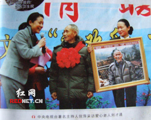 (2006年,老人在赈灾义演现场接受中央电视台主持人倪萍采访)何永康/摄影