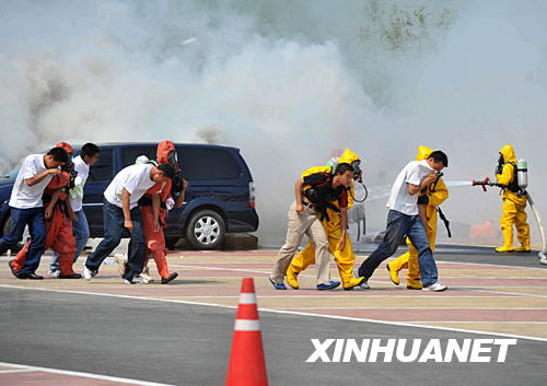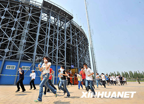 在北京朝阳公园沙滩排球场“观看”比赛的观众在警察和武警的指挥下有序撤离化学“爆炸”现场