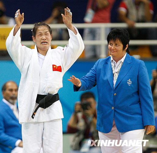 9月7日,中国选手郭华平(左)庆祝胜利。当日,在北京工人体育馆举行的北京2008年残奥会女子柔道48公斤级决赛中,郭华平击败巴西选手卡拉·卡多佐,获得冠军。新华社记者廖宇杰摄