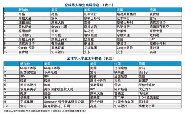 在今年首次亮相的全球华人学生理想雇主榜上,一个引人注意的现象是,尽管身处世界不同角落,各国华人学生的选择还是趋于一致。在欧美和新加坡等5个国家的华人商科学生榜单中,摩根士丹利、摩根大通出现5次,高盛和麦肯锡出现了4次(见表2),而在另一份华人工科学生榜单中,宝马出现4次,IBM、微软各出现3次(见表3)。