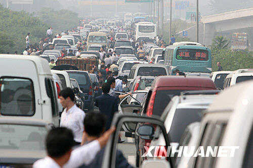 10月1日中午12点之后,受出游车辆过多影响,北京八达岭高速公路昌平西关到八达岭水关路段交通堵塞严重,驾乘人员纷纷走出车外等候通车。 新华社发