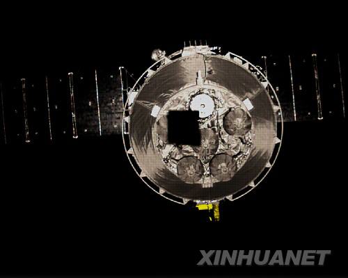 这幅图片为伴星开启后宽视场相机获取的第一张图片,拍摄时间为航天员按下释放按钮后6秒钟,伴星位于飞船前方,距离数米处。照片中轨道舱前部黑影为伴星的日照影子。这是我国获取的第一张观测在轨航天器的图片。新华社发