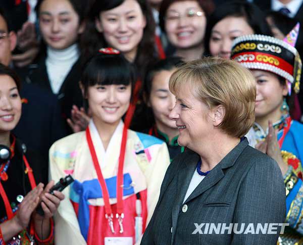 当天,德国总理默克尔在柏林接见了由奥运冠军、奥运优秀志愿者、抗震救灾先进个人代表、基层团组织优秀代表等400名先进典型人物组成的中国青年代表团。新华社记者罗欢欢摄