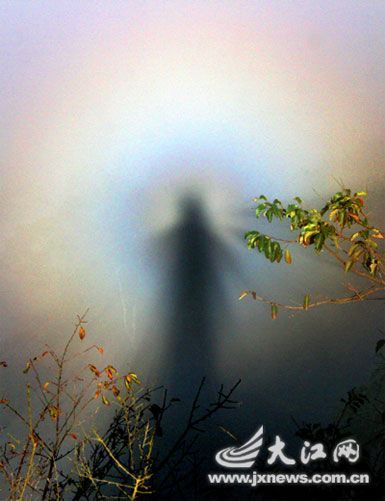 10月27日上午9时20分,井冈山黄洋界景区出现神奇瑰丽的云海日晕景观。光圈中央像是一个人的影子,虚明如镜,外围呈现出红、橙、黄、绿、青、蓝、紫互相交织的七色光环,整个光圈由远及近,由大变小,持续时间长达40分钟之久。