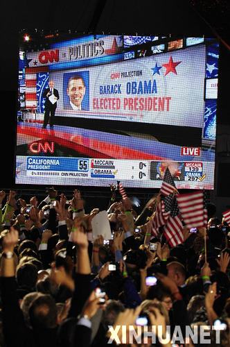 新华网华盛顿11月4日电 美国各大电视网公布的初步统计结果显示,美国民主党总统候选人、伊利诺伊州国会参议员贝拉克·奥巴马在4日举行的总统选举中击败共和党对手、亚利桑那州国会参议员麦凯恩,当选第56届美国总统已成定局。