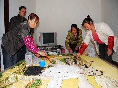 中新社青川四月十四日电 在中国总理温家宝两次踏足的四川极重灾区青川县黄坪乡,当地村民用五谷杂粮制作一幅大型粘贴画:“总理来到枣树村”,艺术再现了温家宝总理亲临枣树村的情景。
