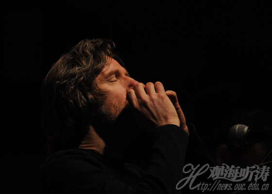 本站讯 音乐无国界,无论你是否会说法语,只要你喜欢摇滚乐,就会融入其中。3月15日晚,由青岛法语联盟主办的法国说唱音乐会在大学生活动中心举行。两个麦克,两把吉他,主唱Kent和吉他伴奏雅克就这样开启了当晚的音乐盛宴。