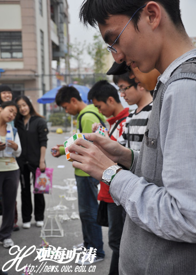 开幕式后,紧接着是挑战爱因斯坦系列活动。活动分为“抗风纸塔”、“粉笔建筑设计”以及“魔方复原”三个部分。“抗风纸塔”中,选手们用扑克牌搭建纸塔,可使用除胶类物质以外的其他各种连接方式。最终5号作品因其美观和结构稳定的特征脱颖而出,喜获第一名佳绩。顾永建点评时说:“这个活动不仅体现同学们的合作精神,而且还体现同学们严肃认真的科学精神。”“粉笔建筑设计”活动要求选手利用粉笔、胶类物质、细绳等材料,制作美观、坚固的建筑模型。在这个比赛中,几个老师也被同学们的参与热情和创意设计带动,加入到粉笔建筑设计的行列中,设计并构建了一个外形类似沙漏的“时间塔”模型。而同学们的参赛作品也各具特色:有人性化的江南水乡楼房,有复古的北方传统建筑,有神秘对称的金字塔,也有帆船样式的海景套房——“奥帆之星”。10号小组设计的海大特色建筑凯旋门引得老师调侃,“不像凯旋门,我看像足球门。”篮球场欢声笑语、其乐融融。据主办方介绍,“粉笔建筑设计”将在网上进行投票,评出最后结果。最后的“魔方复原”比赛中,海洋技术2010级钱征宇以1分12秒57的成绩摘得桂冠,而地球信息科学与技术2010级丁航航和电子信息科学与技术2008级王含笑分获第二名和第三名。