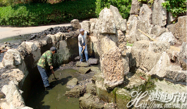 本站讯 为进一步改善鱼山校区的校园环境,近期,校园服务中心对图书馆门前的人工湖进行了集中清理。