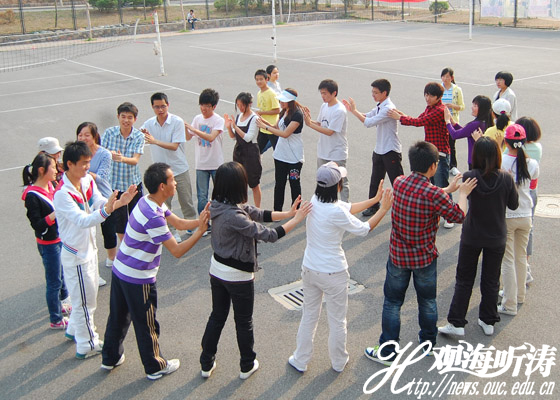 拓展开始前,活动总拓展师方少程对信院2009级与2010级的同学进行动员。拓展活动分为热身、分组、活动三个环节进行。热身活动开始,多数同学第一次参加拓展活动略显拘谨,但笑声从未间断。在活动正式开始之前,所有同学被分为两组,分别进行队长、队秘、队歌、队形、队旗的选拔设计,其中队形必须满足有十五只脚六只手接触地面的要求。