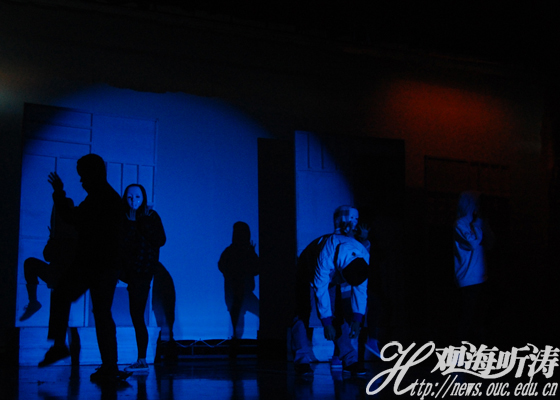本站讯 随着大红色的帷幕缓缓拉开,大学生活动中心的灯光骤然变暗,诡异的蓝光透出舞台,嘈杂的观众席顿时变得鸦雀无声。5月28日晚,中国海洋大学文学与新闻传播学院(以下简称文新学院)尝试剧社以神秘的舞蹈拉开年度大戏《梦想地一层》的帷幕。