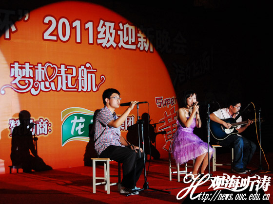 本站讯 柔和的灯光,露天的舞台,今夜凯旋门成为夜幕下焦点。9月4日,作为继信息学院之后又一个露天晚会,管理学院(以下简称管院)迎新晚会仍旧抓住众多海大人的眼球。管院迷彩们纷纷坐在台阶上享受管院大家庭的欢乐与温馨,在辛苦军训训练之余愉悦身心。
