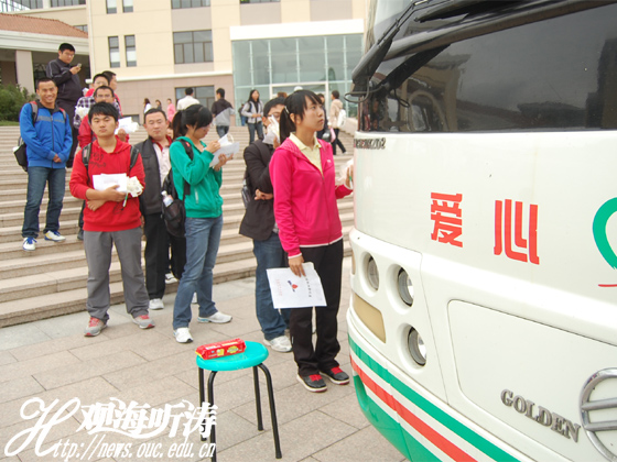 本站讯 “爱在延续,血脉相连”。10月13日下午,由校红十字会学生分会和管理学院志愿者协会联合主办的“无偿献血”活动在崂山校区凯旋门前广场举行。阴沉天气下,献血车上红色“爱心”字样显得格外夺目。