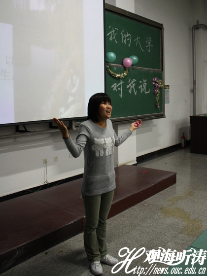 为缓和比赛紧张的气氛,主办方安排了歌曲表演《小酒窝》,引起台下掌声阵阵。表演过后,28号选手郑智炜面带微笑,信心满满地上场。以前有过演讲经历的他凭借良好的台风,颇有文采的语言和丰富的感情赢得评委青睐,夺得第一。赛后他说:“大学告诉我,做个有心人,生活就不再迷茫。其实今天,我也只是做了一个有心人。”32号张旭一出场颇有气势却突然转成抒情风,继而用幽默调侃的语气引得台下笑声不断,给观众留下深刻的印象,极具个人特色。