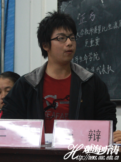 本站讯 对于一流大学而言,师资与生源究竟哪个更重要?10月16日晚,海洋生命学院生物技术2011级(以下简称11生技)与食品科学与工程学院食品科学与工程2011级二班(以下简称11食工2)就此展开激烈争辩。最终,正方11生技获得本场比赛的胜利,最佳辩手为正方二辩刘顿。