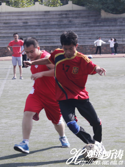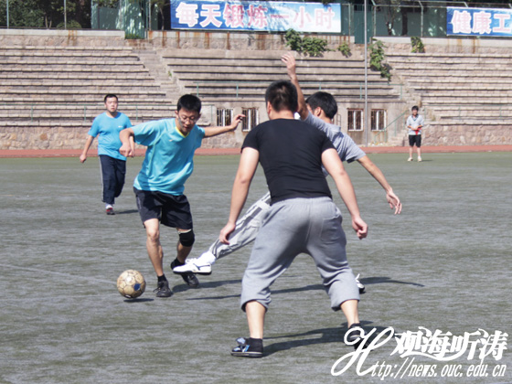 本站讯 10月17日中午,由海洋生命学院学生会主办、体育运动协会承办的七人制足球赛小组赛第一场在鱼山校区足球场开赛。比赛根据《七人制足球赛竞赛规则》,全场60分钟,上、下半场各30分钟,中场休息10分钟。场上共有四支队伍进行比赛。分别是海洋生命学院2009级(以下简称09生命)联队对阵音乐表演2009级(以下简称09音表)代表队,水产养殖(以下简称水养)联队对阵海洋生物资源与环境2011级(以下简称11海资)代表队。酣战过后,09生命联队和水养联队皆以大比分获胜。