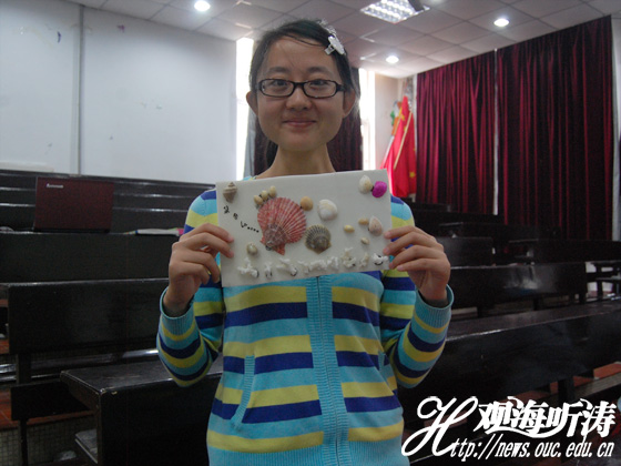 经过一番忙碌,同学们的作品陆续成型。每一组参赛者面带喜悦笑容展示自己的作品。来自生态学2011级的王婷婷和杨丽萌用贝壳摆出“Happy”字样,并希望大家能够时刻保持快乐。周巾煜(2011级药学二班)的作品是一座贝壳堆砌而成的山峰,以此鼓励自己在以后的人生道路中能够勇攀高峰。生物技术2010级的赖伟鸿与海洋生物学2010级的于佳辰合作完成作品“立体珊瑚”,变平面为立体的创意与新颖奇特的设计使大家眼前一亮。