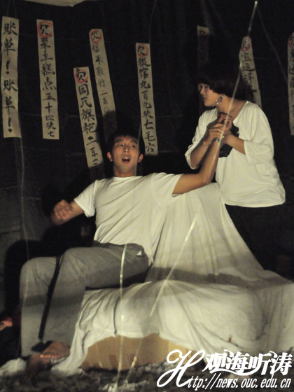 本站讯 走进海鸥小剧场,前排观众席地而坐,用黑布围起的舞台上铺满纸屑,黑布四周贴满欠条,灯光瞬间熄灭,墙壁上投影打出:“我说,这不是灵堂,这是待拆的的剧场”,海鸥小剧场内安静下来,由海鸥剧社改编自曹禺的话剧《日出2011》,10月16日晚在海鸥小剧场正式开演