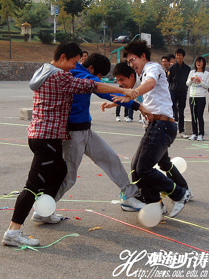 参赛选手分组进行游戏,来自各个学院的同学代表组成八支参赛队伍同场竞技。活动的第一个游戏是“踩气球”,两两组合绑住双脚的选手不仅要保护好绑在自己脚上的气球,还要想方设法踩爆对手脚上的气球。选手们的卖力参与、场外观众的热情欢呼,很快点燃全场的热情。