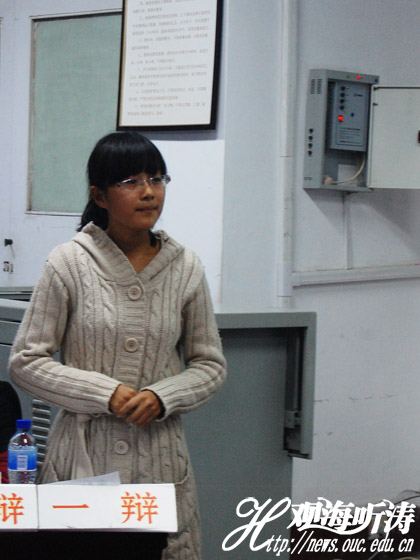 本站讯 9月23日下午,由中国海洋大学学生会主办的鱼山校区新生辩论赛半决赛顺利举行,辩手们就“消费者购买盗版应不应该负法律责任?”这一问题展开辩论。对决双方为生物技术2011级与水产养殖2011级二班,经过一番口舌交锋,最终正方捧得桂冠,最佳辩手为正方宋竞昕。