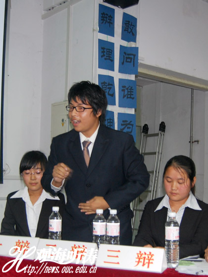 本站讯 10月30日下午,由中国海洋大学(以下简称海大)学生会主办的辩论赛总决赛在新教学楼圆满落幕。在经济迅速发展的当今社会,在人情日渐冷漠的现在,真善之心、真善之行显得尤为可贵,那么真善是以善行为先还是以善心为先?双方辩手就此问题展开热烈辩论。最终反方摘得桂冠,最佳辩手为反方二辩刘顿。