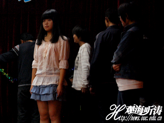 首先,是海洋生命学院(以下简称生命)表演的心理剧《木瓜》。旁白青涩的声音正如那青青的木瓜,也体现出木瓜的迷茫与无奈。上课时,木瓜时常发呆,但一次课上,一位男生朗诵的《那一瞬》却换回她游离的心神,同时给予她一丝悸动,偷偷的爱慕就此开始。她每周四在广播站播音,却得到那男生一句“你的声音比你的人更温柔”,台下观众一片呼声。最终,她为接近他而努力,考入海大,与他碰面后才知道,原来他,也爱过她。初恋,如同木瓜般的青涩。由于演出过程中声音太小,“我没弄懂他们在说什么”海洋生物资源与环境2011级徐晓萌说到。
