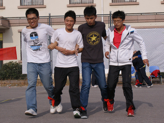 随后在主持人的安排下,趣味运动会开始进行。各个宿舍在工作人员的带领下分别参加“四人五足”“你做我猜”“我是乔丹”“夹气球”等活动。在“四人五足”环节中,四名舍友将脚挨个捆在一起,裁判一声哨响便喊着“一二一”的口令、相互搂着肩膀向前迈进。额上冒着汗珠,脚下困难地支撑着平衡,但同学们的脸上却挂着轻松的笑容。