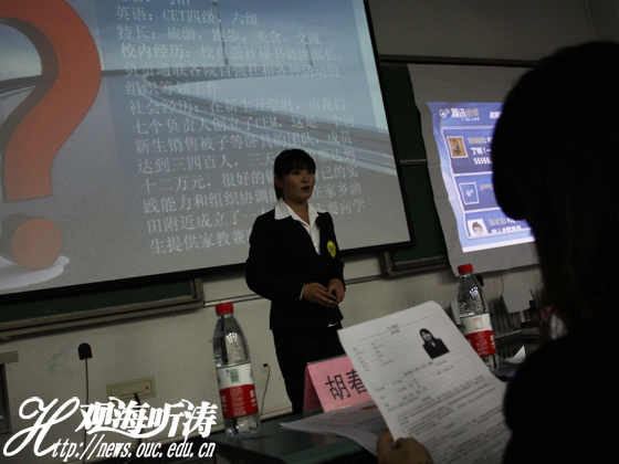 本站讯 “你去哪儿呀?”“当然是去海大版‘职来职往’决赛的现场啊!”11月4日晚,经济学院校园版“职来职往”模拟求职大赛决赛精彩上演。比赛前夕,记者在八区过道里听到上面的对话。本次比赛共有6位选手一路过关斩将,杀进决赛现场。担任本次决赛的评委有:中国海洋大学毕业生就业指导中心资深就业指导老师陈丽红、莱邦物流总经理贾渊源、东海证券顾问胡春燕、经济学院团委书记边洋、经济学院团委副书记蓝雷波。此外,本次比赛还与招商银行、PICC等公司达成协议,上述公司将为选手们提供三个实习名额。