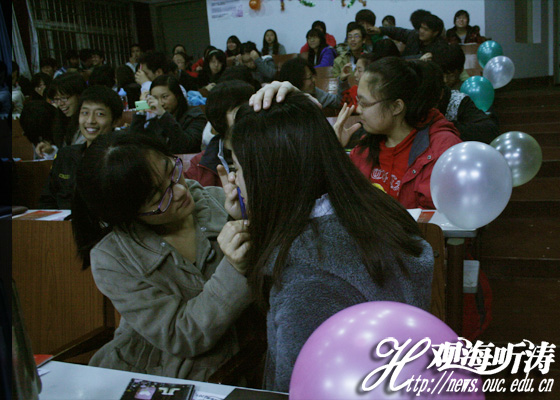 万月霞强调,学会化妆首先要了解自己的面部特征,只有选择适合自己的妆容,才能体现出最美的自己。随后其为大家展示标准的五官比例。在她的带动下,同学们纷纷相互丈量面部比例,有的甚至动用尺子,忙得不亦乐乎。当王月霞为观众展示妆前妆后的对比图时,现场一片惊呼,借用主讲人一句话“妆前像大妈,妆后变少女”,让大家切切实实感受到化妆的神奇与魅力。
