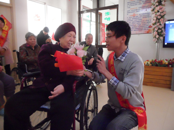 揭牌仪式结束后,大学生志愿者为老人们献上精彩的文艺演出。同学深情演唱的《把一切献给党》《儿行千里》《母亲》《父亲》唤起了老人们的幸福之感,使他们听这些歌曲后激动地流下泪水,与志愿者亲切地握手,献上自己手中挥动的鲜花、五星红旗,台下不时响起阵阵掌声,将现场气氛推向高潮。