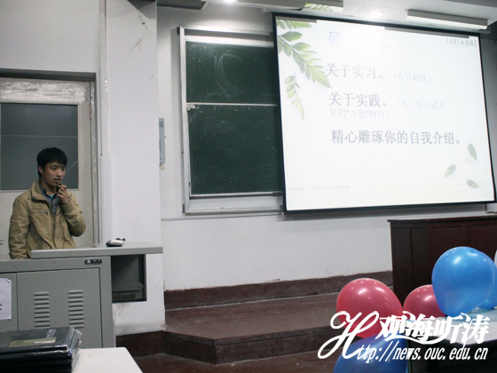 第二位出场的是水产养殖2008级二班的孙磊,他主要跟大家分享自己的求职经历。首先,他介绍获取工作信息的几个途径,比如学校的毕业生就业信息网、各大高校招聘会等。随后他就自己应聘过的单位向大家简单介绍求职的过程并提出自己的两条建议:第一是心态上的准备,即要阳光、自信、积极主动、追求完美并注重细节;第二是硬件准备,即要精心雕琢自我介绍,养成爱总结的好习惯。他认为建功立业的秘诀就是立即行动。