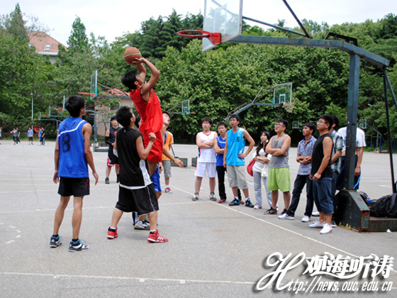本站讯 5月30日中午,由食品科学与工程学院(以下简称食品)学生会主办的“三人制”篮球赛半决赛在鱼山校区篮球场打响。A2(食品与医药学院联队)对阵C4(海洋生命学院代表队),B1(音乐表演系代表队)对抗D3(水产学院代表队)。经过激烈角逐,B1与C4队携手打入决赛。