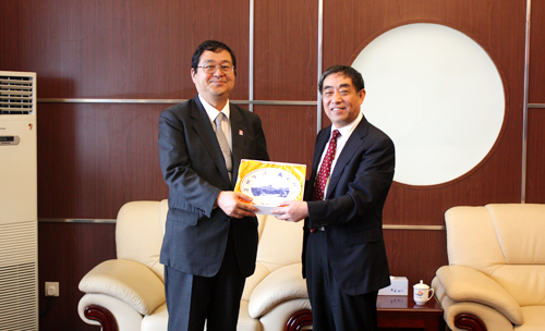 吴德星校长(右)向平木场弘人赠送纪念品