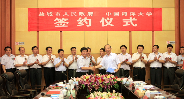 中国海洋大学副校长李华军代表学校与盐城市人民政府常务副市长戴元湖分别在合作框架协议上签字。同时签署的还有与大丰市人民政府和江苏相关企业的具体合作协议。