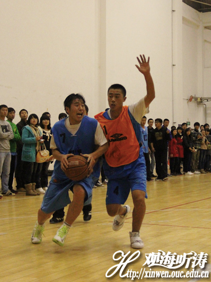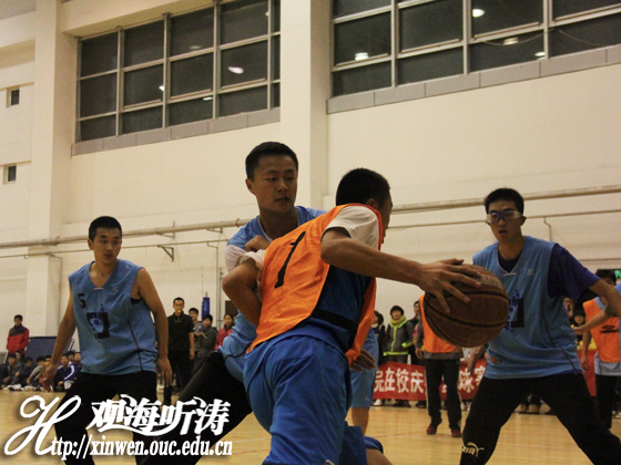 本站讯 11月10日晚,校庆杯篮球赛四分之一决赛在校体育馆副馆进行,本场比赛由法政学院(以下简称法政)对阵海洋环境学院(以下简称海环)。
