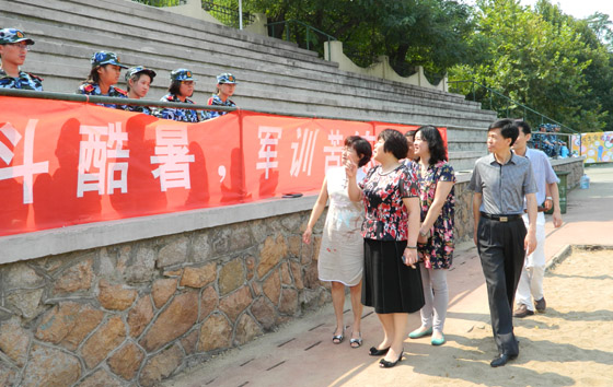 8月31日和9月2日,校党委张静副书记在新生军训团团长、党委武装部李春雷部长以及军训团政委、学生工作处初建松处长的陪同下,分别查看了崂山校区及鱼山校区2013级学生军训情况。在现场,张静询问了新生们的训练进度、精神状态及训练效果,并慰问了参训学生。张静对2013年学生军训工作给予了肯定,并要求在抓军训质量的同时也要保证学生们的身体健康。李春雷希望广大军训教官,在加强新生体能训练的同时,抓好军事理论学习和内务整理,开展切实有效的国防教育,注重培养学生的集体荣誉感,增强组织观念和纪律意识。
