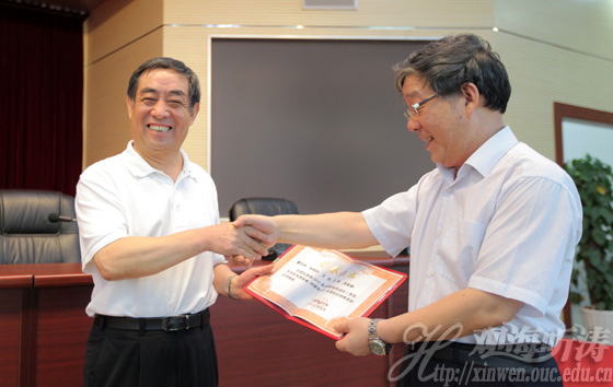 吴德星校长(左)为获得2012年度校长特殊奖励的董双林教授团队颁发证书