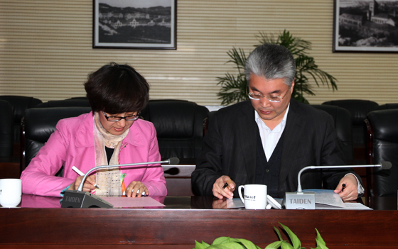 于志刚书记(右)代表学校党委与新提拔和岗位变动的正处级领导干部签订《中国海洋大学党风廉政建设责任书》和《中国海洋大学领导干部廉洁自律承诺书》